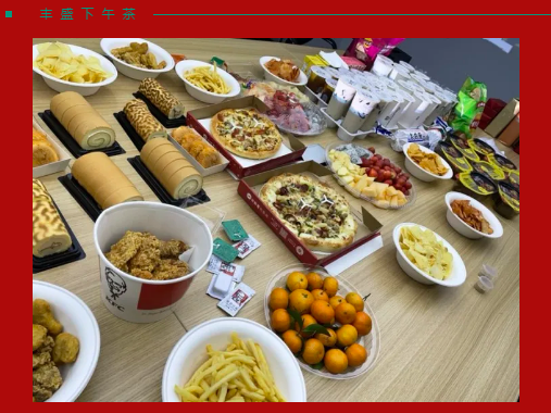 行政中心的小姐姐為大家準備了水果盤、糕點、披薩、奶茶、炸雞薯條等小吃。