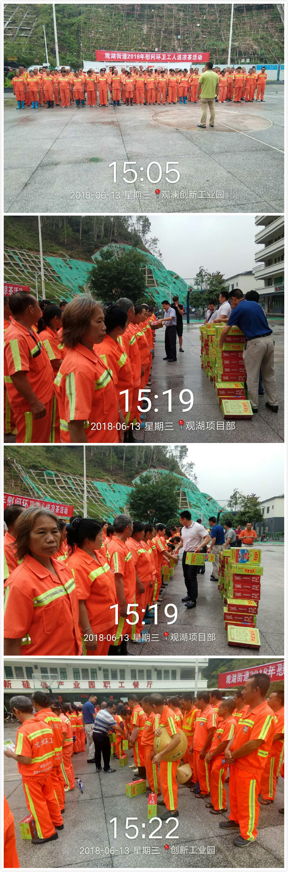 炎炎夏日,觀湖街道辦曾書(shū)記、姜副主任;觀湖市政服務(wù)中心的陶隊(duì)、關(guān)隊(duì)及公司領(lǐng)導(dǎo)為觀湖一線環(huán)衛(wèi)工人們送上了涼茶、防暑藥物等物品。