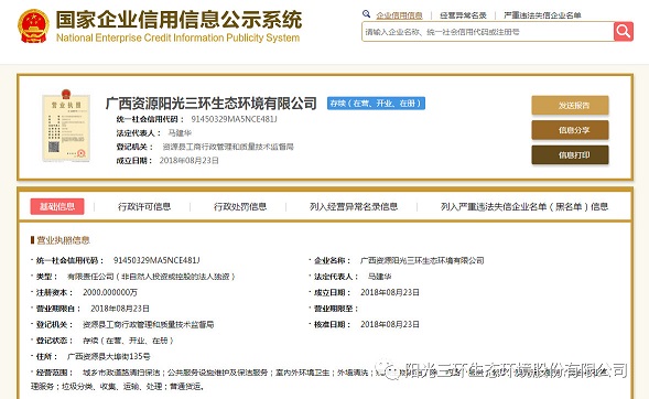 2018年8月23日,廣西資源陽光三環(huán)生態(tài)環(huán)境有限公司在工商局注冊登記完成。此公司為深圳市陽光三環(huán)生態(tài)環(huán)境股份有限公司(股票代碼:870901)全資子公司。