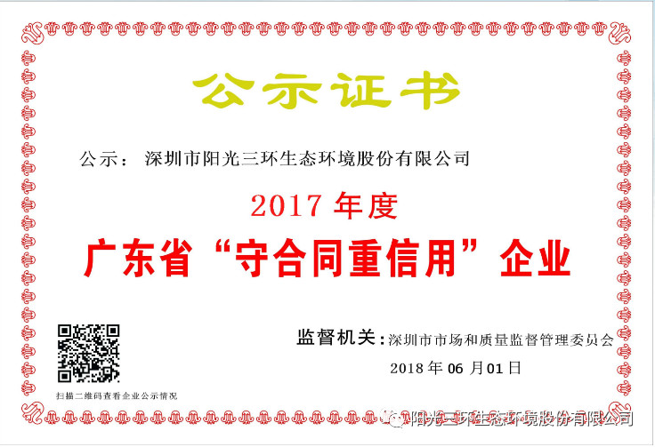 賀!陽光三環(huán)獲2017年度廣東省“守合同重信用”企業(yè)