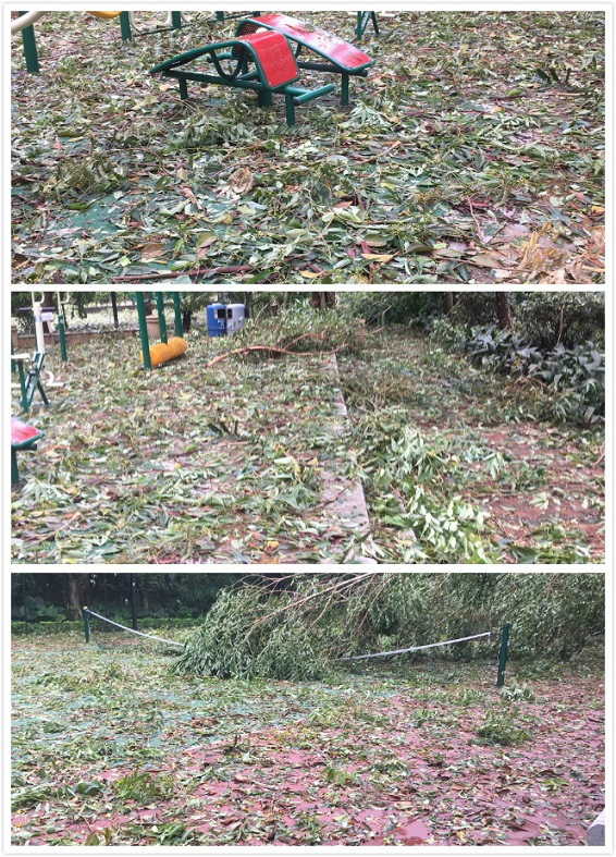 臺風過境后路面上滿地的落葉垃圾以及斷落的樹枝。