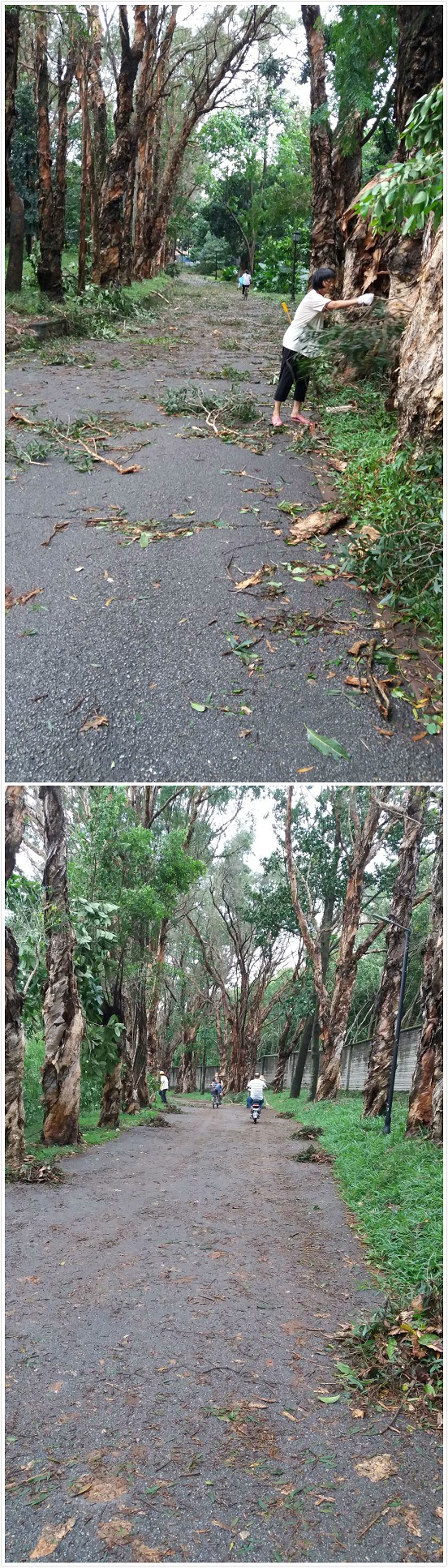 華南植物園的清潔工人們中午加班加點對植物園內(nèi)斷落的大植被葉片以及道路上的落葉進行清理,讓大家的出行道路更干凈、順暢。