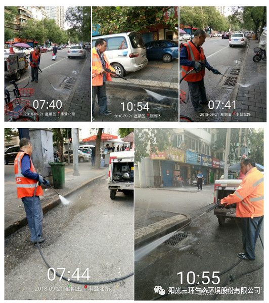 人機結合,組織保潔員清掃衛(wèi)生死角,使用高壓水槍沖洗下水井口油污,確保道路見本色。