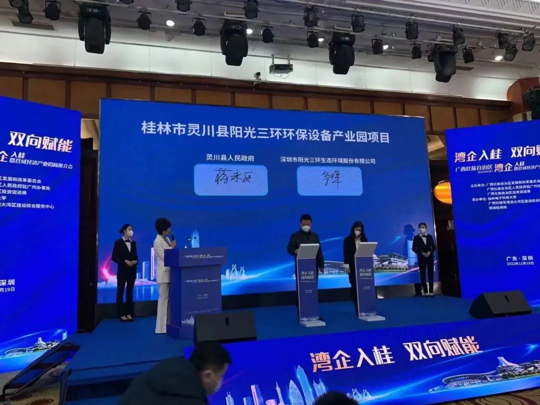 深圳市陽(yáng)光三環(huán)生態(tài)環(huán)境股份有限公司的副總裁余輝,作為廣東方代表之一,出席了該推介會(huì),并代表我司與靈川縣人民政府就“桂林市靈川縣陽(yáng)光三環(huán)環(huán)保設(shè)備產(chǎn)業(yè)園項(xiàng)目”進(jìn)行了投資意向的簽約。