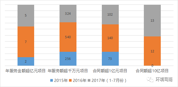2016年合同金額超10億元的新簽環(huán)衛(wèi)項目為12個,2017年1-7月份合同金額超10億元的新簽環(huán)衛(wèi)項目為11個,而2015年此類項目為零。