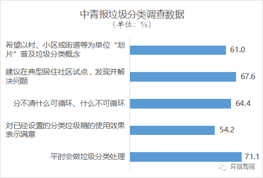 近日,中國青年報社社會調(diào)查中心聯(lián)合問卷網(wǎng),對2005名受訪者進(jìn)行的一項(xiàng)調(diào)查顯示,71.1%的受訪者平時會做垃圾分類處理,54.2%的受訪者對已經(jīng)設(shè)置的分類垃圾箱的使用效果表示滿意。垃圾分類進(jìn)展緩慢,64.4%的受訪者直言分不清什么可循環(huán)、什么不可循環(huán)。67.6%的受訪者建議在典型居住社區(qū)試點(diǎn),發(fā)現(xiàn)并解決問題,61.0%的受訪者希望以村、小區(qū)或街道等為單位“劃片”普及垃圾分類概念。