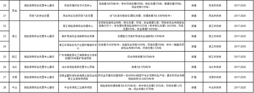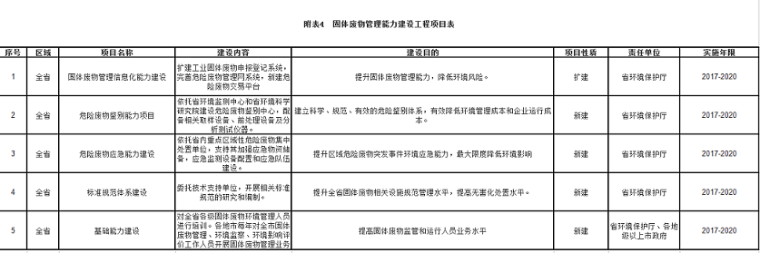 (二十八)實(shí)施重點(diǎn)工程。為落實(shí)行動計(jì)劃目標(biāo)任務(wù),實(shí)施一批重點(diǎn)工程,充分發(fā)揮骨干企業(yè)在固體廢物處置利用行業(yè)的主力作用和標(biāo)桿作用,加快解決當(dāng)前固體廢物污染防治存在的突出問題。重點(diǎn)工程包括危險(xiǎn)廢物安全處理處置、醫(yī)療廢物安全處理處置、工業(yè)固體廢物綜合利用、固體廢物管理能力建設(shè)等4大類工程,具體項(xiàng)目見附表。污泥無害化處理處置及生活垃圾無害化處理處置具體工程按照《廣東省城鄉(xiāng)生活污水處理設(shè)施建設(shè)“十三五”規(guī)劃》和《廣東省城鄉(xiāng)生活垃圾處理“十三五”規(guī)劃》執(zhí)行。