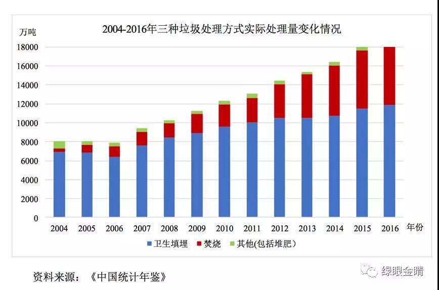 垃圾處理有三種形式:填埋、焚燒及其它(堆肥等)。受制于城市土地資源限制,焚燒是其中增長最快的處理方式,2004-2016 年,焚燒復合增長率達 26.27% ,目前約占1/3份額。預計還有1倍增長空間。根據(jù)中國固廢網(wǎng)E20研究院測算,到2020年,我國垃圾焚燒處理率將達到 50%,市場投資空間、建設空間約在 1000億元左右。